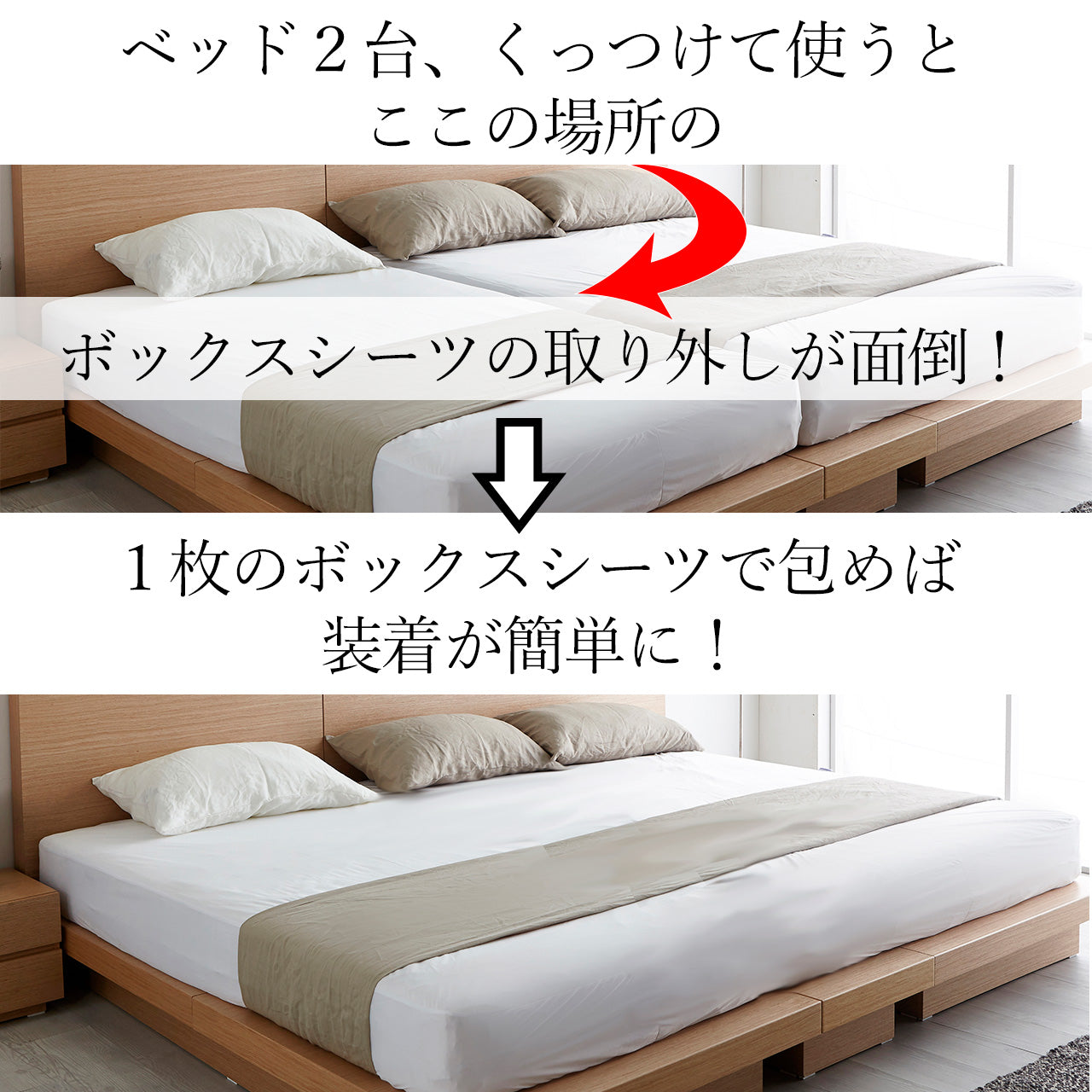 シングルベッド(97x195cm)を2台並べると、約194 x 195cmになります。シングルのボックスシーツのサイズは、100x200cm で、作られています。