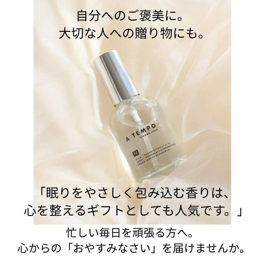 A. シンプルで上品なボトルデザインは贈り物にも好評です。リラックス・安眠をテーマにしたギフトとして、男女問わず喜ばれます。